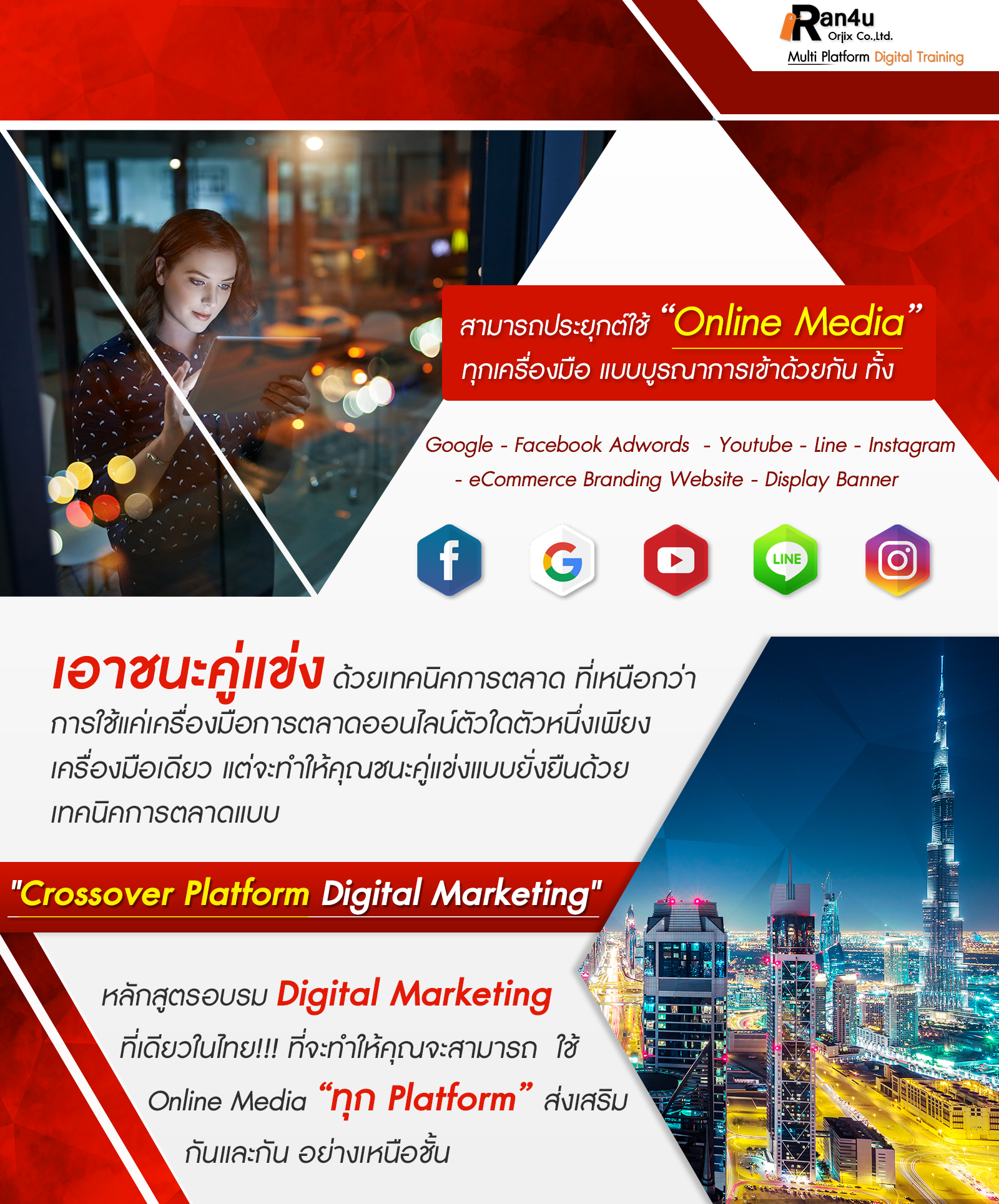 อบรมการตลาดดิจิทัลสำหรับ ธุรกิจ ผู้ประกอบการ บุคคลทั่วไป เรียนรู้เจาะลึกวิธีใช้สื่อการตลาดดิจิทัลทั้ง 12 เครื่องมือของ Google และ Facebook อย่างถูกวิธีส่งผลให้เกิดกำไรได้สูงที่สุด