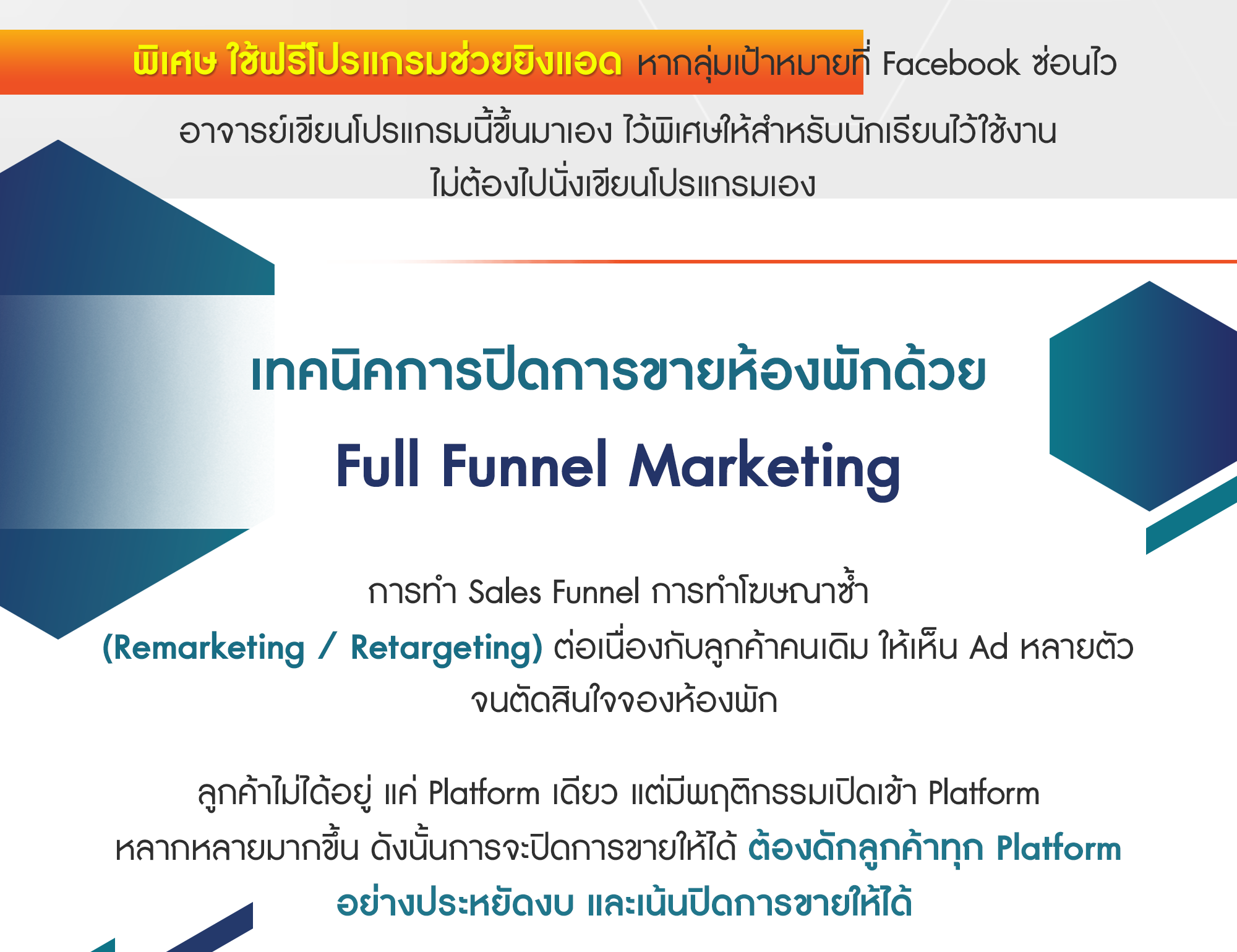 | ถ่ายทอด เทคนิค "ลับเฉพาะ" 5 สุดยอดเทคนิค การสร้าง Ads แบบลึกล้ำ!! เล่นกับการกำหนดเป้าหมายด้วย "ข้อมูลประชากร" และ "ความสนใจ" ของผู้ใช้ Facebook อย่างแยบยล สร้างการรับรู้แบบ "สะกดใจ" เฉพาะบุคคล ต้องหยุดดูโฆษณาของเรา แน่นอน!! |