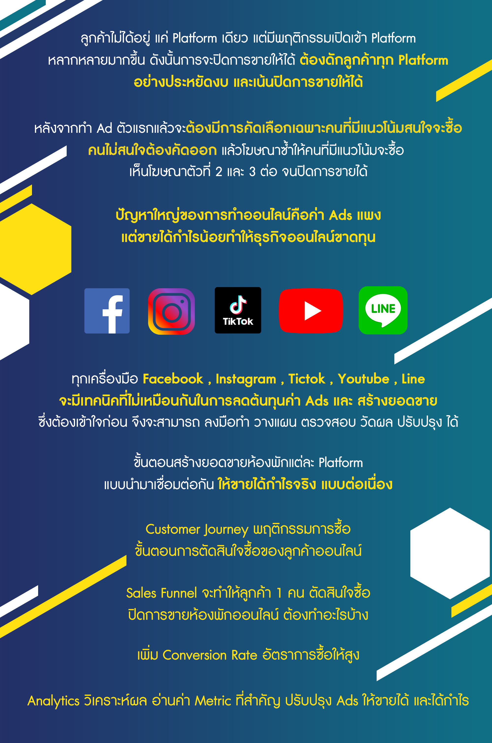 | ทุกเครื่องมือ Facebook , Instagram , Google Search , Youtube , Line จะมีเทคนิคที่ไม่เหมือนกันในการลดต้นทุนค่า Ads และ สร้างยอดขาย ซึ่งต้องเข้าใจก่อน จึงจะสามารถ ลงมือทำ วางแผน ตรวจสอบ วัดผล ปรับปรุง ได้ |