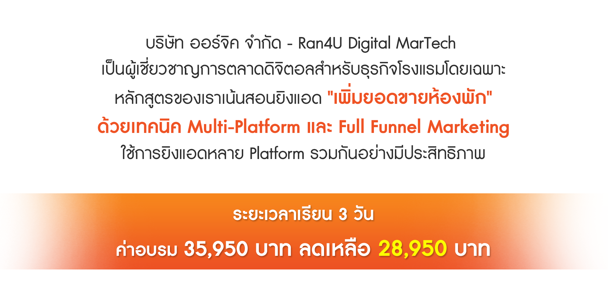 เนื้อหาอบรมหลักทั้งหมด ใช้เวลาอบรม 6 วัน เต็ม เน้น Workshop ลงมือทำจริงตลอดการอบรม รอบเดือน กุมภาพันธ์ (เต็มแล้ว) รอบเดือน มีนาคม (เต็มแล้ว) รอบเดือน เมษายน (เต็มแล้ว) รอบเดือน กันยายน (เต็มแล้ว) รอบเดือน ตุลาคม (เต็มแล้ว) รอบเดือน พฤศจิกายน (เต็มแล้ว) รอบเดือน ธันวาคม (เต็มแล้ว) รอบเดือน มกราคม (เหลือ 2 ที่สุดท้าย) รอบมีนาคม เรียนวัน เสาร์ อาทิตย์ จันทร์ รวมทั้งหมด 6 วัน (เต็มแล้ว) - ค่าลงทะเบียนราคาพิเศษ 35,900 บาท ลดจากปกติ 45,900 บาท วันที่ 1 - วันเสาร์ที่ 13 มีนาคม 2564 เวลา 10.00-18.00 น. วันที่ 2 - วันอาทิตย์ที่ 14 มีนาคม 2564 เวลา 10.00-18.00 น. วันที่ 3 - วันจันทร์ที่ 15 มีนาคม 2564 เวลา 10.00-18.00 น. วันที่ 4 - วันเสาร์ที่ 27 มีนาคม 2564 เวลา 10.00-18.00 น. วันที่ 5 - วันอาทิตย์ที่ 28 มีนาคม 2564 เวลา 10.00-18.00 น. วันที่ 6 - วันจันทร์ที่ 29 มีนาคม 2564 เวลา 10.00-18.00 น. สามารถเลือกเรียน แบ่งเรียนแค่ 3 วันได้ A. เลือกเรียน Google อย่างเดียว 3 วัน 17,950 บาท (เรียนวันที่ 13,14,15 มีนาคม) B. เลือกเรียน Facebook อย่างเดียว 3 วัน 17,950 บาท (เรียนวันที่ 27,28,29 มีนาคม) รอบเมษายน เรียนวัน เสาร์ อาทิตย์ จันทร์ รวมทั้งหมด 6 วัน (เต็มแล้ว) - ค่าลงทะเบียนราคาพิเศษ 35,900 บาท ลดจากปกติ 45,900 บาท วันที่ 1 - วันเสาร์ที่ 24 เมษายน 2564 เวลา 10.00-18.00 น. วันที่ 2 - วันอาทิตย์ที่ 25 เมษายน 2564 เวลา 10.00-18.00 น. วันที่ 3 - วันจันทร์ที่ 26 เมษายน 2564 เวลา 10.00-18.00 น. วันที่ 4 - วันเสาร์ที่ 1 พฤษภาคม 2564 เวลา 10.00-18.00 น. วันที่ 5 - วันอาทิตย์ที่ 2 พฤษภาคม 2564 เวลา 10.00-18.00 น. วันที่ 6 - วันจันทร์ที่ 3 พฤษภาคม 2564 เวลา 10.00-18.00 น. สามารถเลือกเรียน แบ่งเรียนแค่ 3 วันได้ A. เลือกเรียน Google อย่างเดียว 3 วัน 17,950 บาท (เรียนวันที่ 24,25,26 เมษายน) B. เลือกเรียน Facebook อย่างเดียว 3 วัน 17,950 บาท (เรียนวันที่ 1,2,3 พฤษภาคม) รอบพฤษภาคม เรียนวัน เสาร์ อาทิตย์ จันทร์ รวมทั้งหมด 6 วัน (หยุดอบรม) - ค่าลงทะเบียนราคาพิเศษ 35,900 บาท ลดจากปกติ 45,900 บาท วันที่ 1 - วันเสาร์ที่ 22 พฤษภาคม 2564 เวลา 10.00-18.00 น. วันที่ 2 - วันอาทิตย์ที่ 23 พฤษภาคม 2564 เวลา 10.00-18.00 น. วันที่ 3 - วันจันทร์ที่ 24 พฤษภาคม 2564 เวลา 10.00-18.00 น. วันที่ 4 - วันเสาร์ที่ 29 พฤษภาคม 2564 เวลา 10.00-18.00 น. วันที่ 5 - วันอาทิตย์ที่ 30 พฤษภาคม 2564 เวลา 10.00-18.00 น. วันที่ 6 - วันจันทร์ที่ 31 พฤษภาคม 2564 เวลา 10.00-18.00 น. สามารถเลือกเรียน แบ่งเรียนแค่ 3 วันได้ A. เลือกเรียน Google อย่างเดียว 3 วัน 17,950 บาท (เรียนวันที่ 22,23,24 พฤษภาคม) B. เลือกเรียน Facebook อย่างเดียว 3 วัน 17,950 บาท (เรียนวันที่ 29,30,31 พฤษภาคม) หยุดอบรม 4 เดือน รอบตุลาคม เรียนวัน เสาร์ อาทิตย์ จันทร์ รวมทั้งหมด 6 วัน (เต็มแล้ว) - ค่าลงทะเบียนราคาพิเศษ 35,900 บาท ลดจากปกติ 45,900 บาท วันที่ 1 - วันเสาร์ที่ 16 ตุลาคม 2564 เวลา 10.00-18.00 น. วันที่ 2 - วันอาทิตย์ที่ 17 ตุลาคม 2564 เวลา 10.00-18.00 น. วันที่ 3 - วันจันทร์ที่ 18 ตุลาคม 2564 เวลา 10.00-18.00 น. วันที่ 4 - วันเสาร์ที่ 30 ตุลาคม 2564 