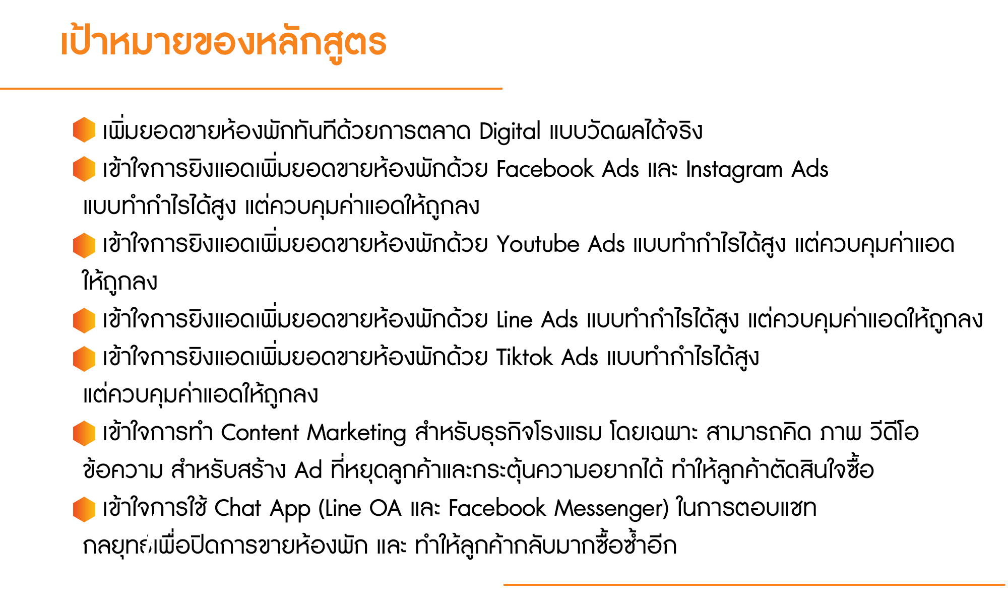 หลักสูตรนี้ เน้นสร้างยอดขายออนไลน์ได้จริง ต้องขายได้ต่อเนื่อง และ เสียงบการตลาดให้ถูกกว่า เน้นการเพิ่ม ROI (Return on Investment) สร้างยอดขายออนไลน์ได้สูง และลดต้นทุนค่าโฆษณาให้ถูกลง ทำให้กำไรสูงกว่าต้นทุนโฆษณา ซึ่งสำคัญมาก ๆ