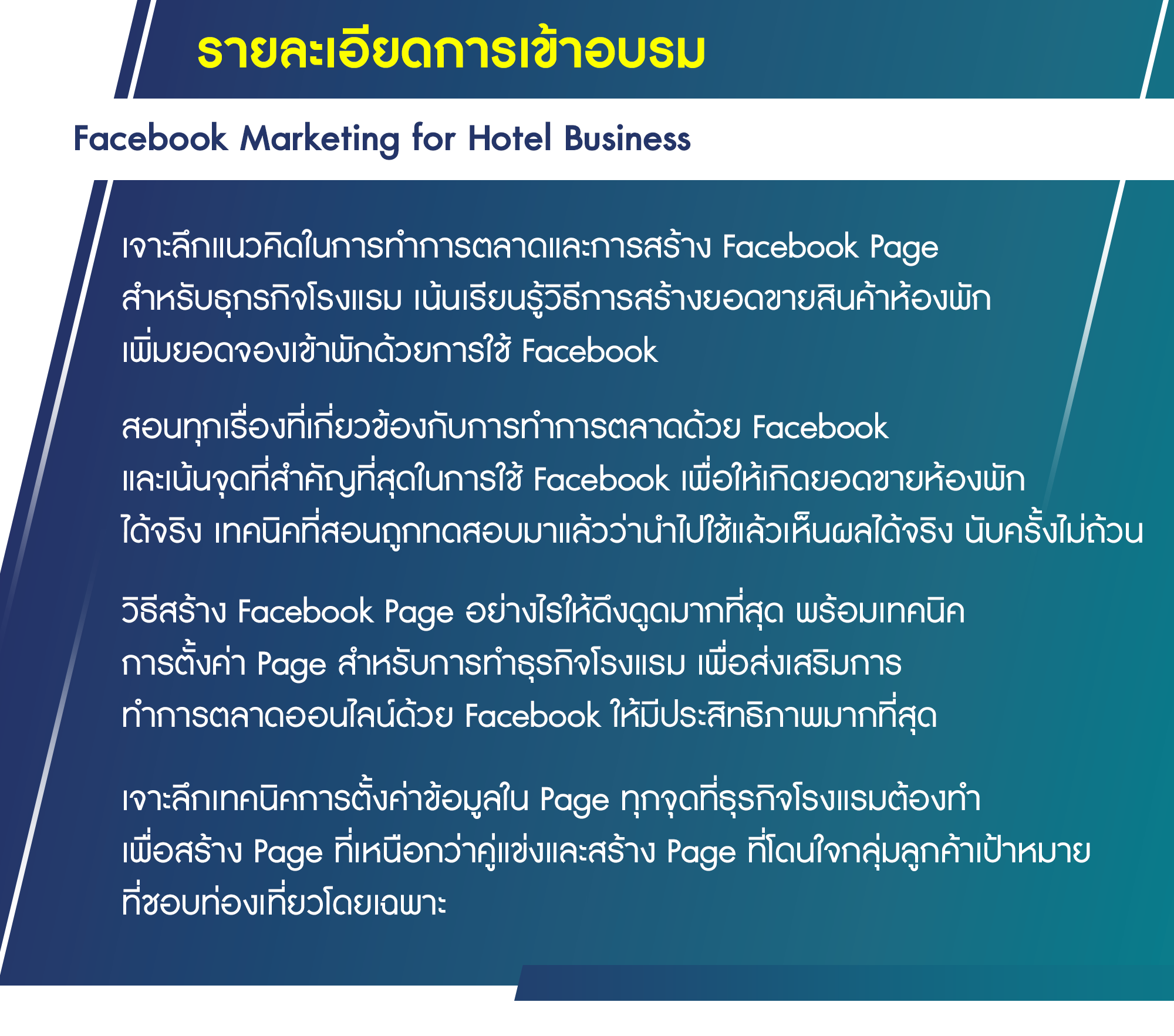 เรียนรู้การสร้างและดูแลเพจ Facebook อย่างมีประสิทธิภาพ - เริ่มสร้างและใช้งานเพจ , การตั้งค่าเพจ , การจัดการเพจ Facebook , การโปรโมทเพจ , การสร้างและโปรโมทโพสต์บน Facebook , การรับส่งข้อความบนเพจด้วย Facebook Messenger บริหารการโต้ตอบ Chat กับลูกค้าอย่างมืออาชีพ, การวิเคราะห์ข้อมูลเชิงลึกในเพจ