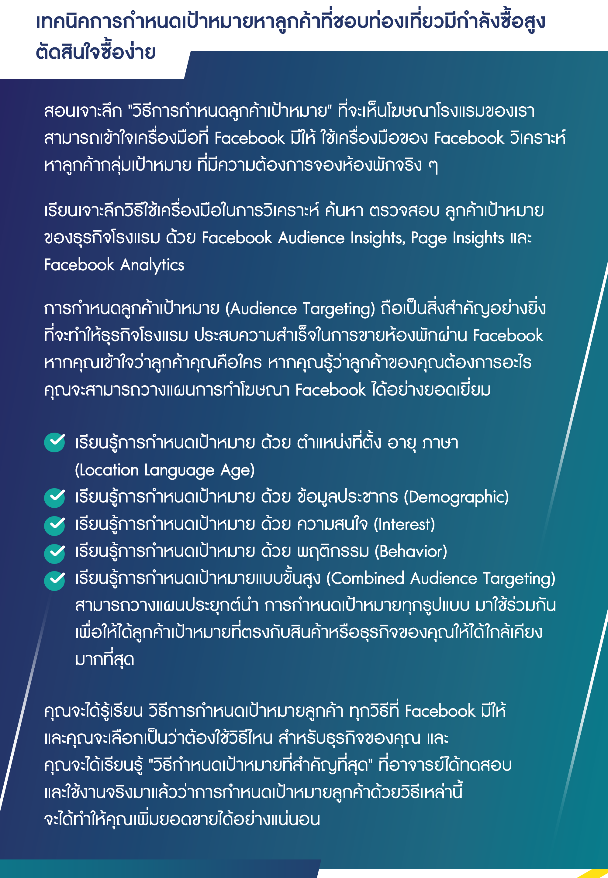เรียนเจาะลึกวิธีใช้เครื่องมือในการวิเคราะห์ ค้นหา ตรวจสอบ ลูกค้าเป้าหมายของธุรกิจของเรา ด้วย Facebook Audience Insights, Page Insights และ Facebook Analytics การกำหนดลูกค้าเป้าหมาย (Audience Targeting) ถึงเป็นสิ่งสำคัญอย่างยิ่งที่จะทำให้ธุรกิจ ประสบความสำเร็จในการขายผ่าน Facebook หากคุณเข้าใจว่าลูกค้าคุณคือใคร หากคุณรู้ว่าลูกค้าของคุณต้องการอะไร คุณจะสามารถวางแผนการทำโฆษณา Facebook ได้อย่างยอดเยี่ยม เรียนรู้การกำหนดเป้าหมาย ด้วย ตำแหน่งที่ตั้ง อายุ ภาษา (Location Language Age) เรียนรู้การกำหนดเป้าหมาย ด้วย ข้อมูลประชากร (Demographic) เรียนรู้การกำหนดเป้าหมาย ด้วย ความสนใจ (Interest) เรียนรู้การกำหนดเป้าหมาย ด้วย พฤติกรรม (ฺBehavior) เรียนรู้การกำหนดเป้าหมายแบบขั้นสูง (Combined Audience Targeting) สามารถวางแผนประยุกต์นำ การกำหนดเป้าหมายทุกรูปแบบ มาใช้ร่วมกัน เพื่อให้ได้ลูกค้าเป้าหมายที่ตรงกับสินค้าหรือธุรกิจของคุณให้ได้ใกล้เคียงมากที่สุด คุณจะได้รู้เรียน วิธีการกำหนดเป้าหมายลูกค้า ทุกวิธีที่ Facebook มีให้ และคุณจะเลือกเป็นว่าต้องใช้วิธีไหน สำหรับธุรกิจของคุณ และคุณจะได้เรียนรู้ "วิธีกำหนดเป้าหมายที่สำคัญที่สุด" ที่อาจารย์ได้ทดสอบและใช้งานจริงมาแล้วว่าการกำหนดเป้าหมายลูกค้าได้วิธีเหล่านี้จะได้ทำให้คุณเพิ่มยอดขายได้อย่างแน่นอน |