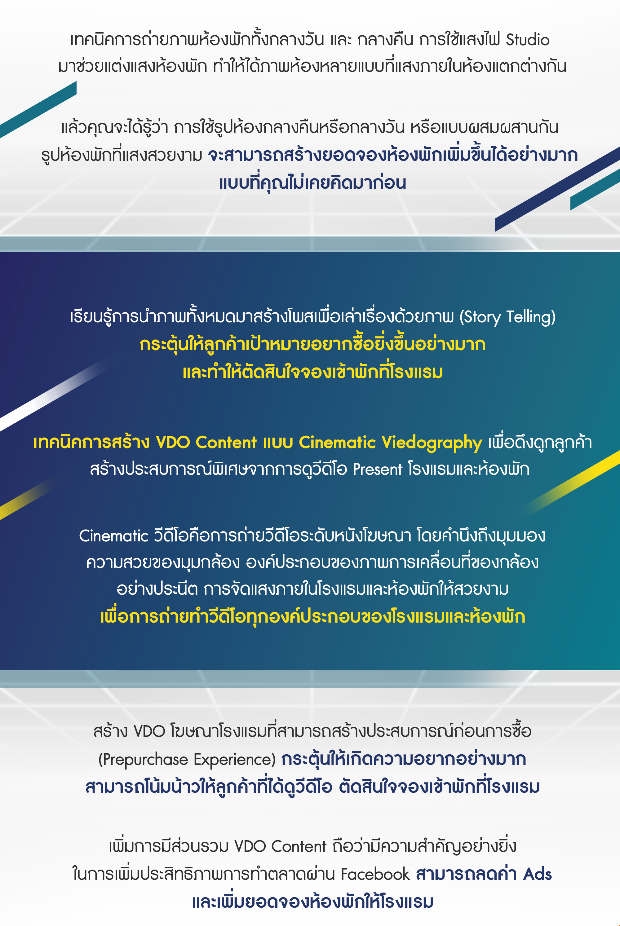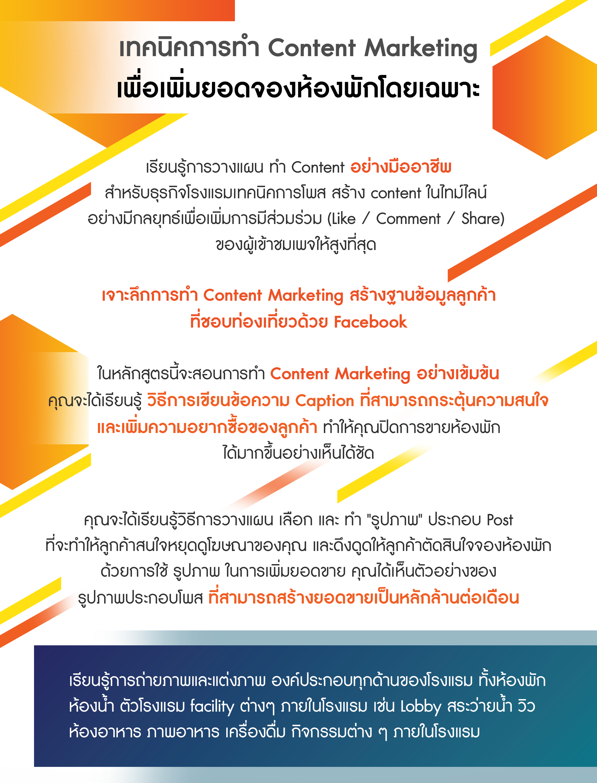 ในหลักสูตรนี้จะสอนการทำ Content Marketing อย่างเข้มข้น คุณจะได้เรียนรู้ วิธีการเขียนข้อความ Caption ที่สามารถกระตุ้นความสนใจและเพิ่มความอยากซื้อของลูกค้า ทำให้คุณปิดการขายได้มากขึ้นอย่างเห็นได้ชัด คุณจะได้เรียนรู้วิธีการวางแผน เลือก และ ทำ "รูปภาพ" ประกอบ Post ที่จะทำให้ลูกค้าสนใจหยุดดูโฆษณาของคุณ และดึงดูดให้ลูกค้าตัดสินใจซื้อ ด้วยการใช้ รูปภาพ ในการเพิ่มยอดขาย คุณได้เห็นตัวอย่างของ รูปภาพประกอบโพส ที่สามารถสร้างยอดขายเป็นหลักล้านต่อเดือน เทคนิคการสร้าง VDO Content เพื่อดึงดูกลูกค้าเพิ่มการมีส่วนรวม VDO Content ถือว่ามีความสำคัญอย่างยิ่งในการเพิ่มประสิทธิภาพการทำตลาดผ่าน Facebook สามารถลดค่า Ads และเพิ่มยอดขายให้ธุรกิจ เราจะสอนทุกวิธีการสร้าง VDO Post และคุณได้รู้ว่า รูปแบบ หรือ VDO Format ในลักษณะใดที่จะทำให้คุณขายได้เพิ่มขึ้น |