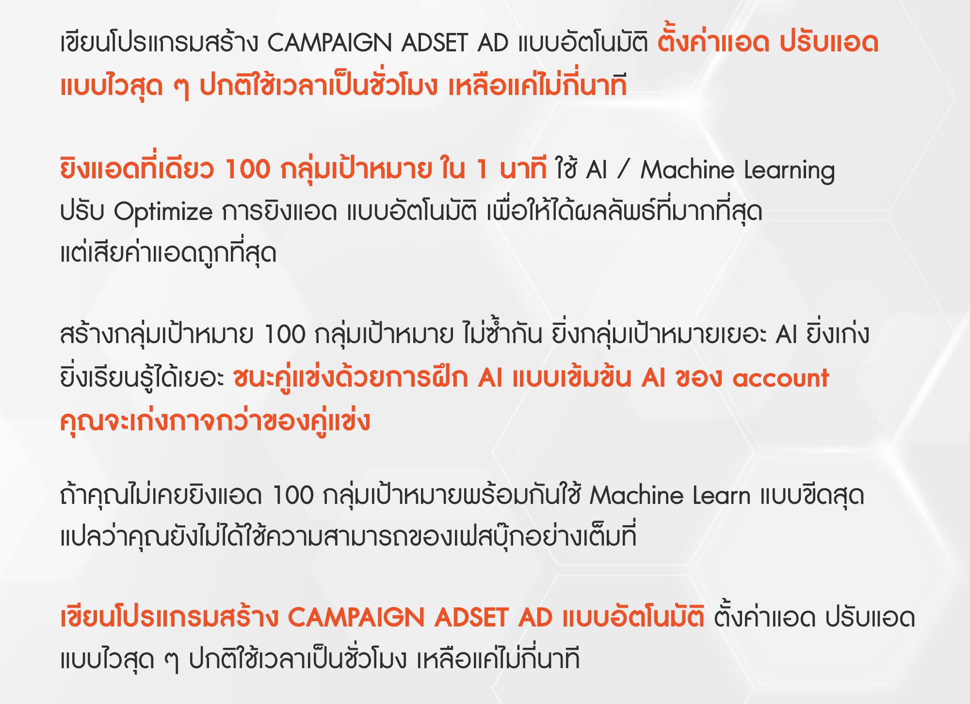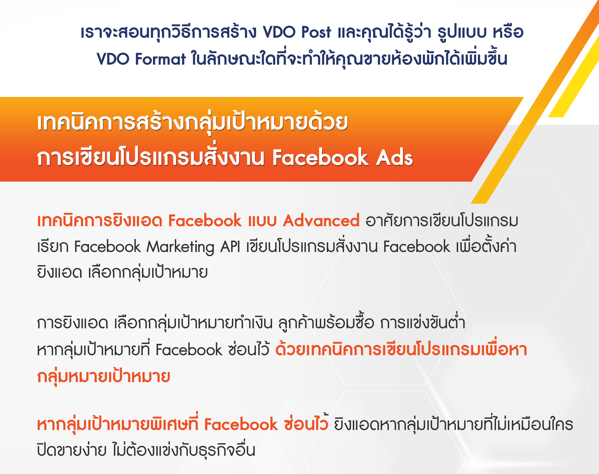 | ไม่ใช้แค่สอนให้คุณตั้งโฆษณาเก่ง , ไม่ใช้แค่สอนให้คุณรู้ทุกเทคนิคในการกำหนดกลุ่มเป้าหมาย , ไม่ใช้แค่สอนให้คุณแค่อ่าน Report หรือดูค่าสถิติเป็นทุกค่า เพราะ ต่อให้คุณตั้งโฆษณาเก่งมาก หรือ รู้และเชี่ยวชาญในทุกเครื่องมือโฆษณาที่ Facebook มีให้ แต่ถ้าคุณไม่รู้วิธีที่จะนำ Facebook มาประยุกต์ใช้ในธุรกิจ "ให้เป็น" และ สามารถทำให้เกิด "ยอดขายได้แบบต่อเนื่อง" ก็ไม่มีประโยชน์ |