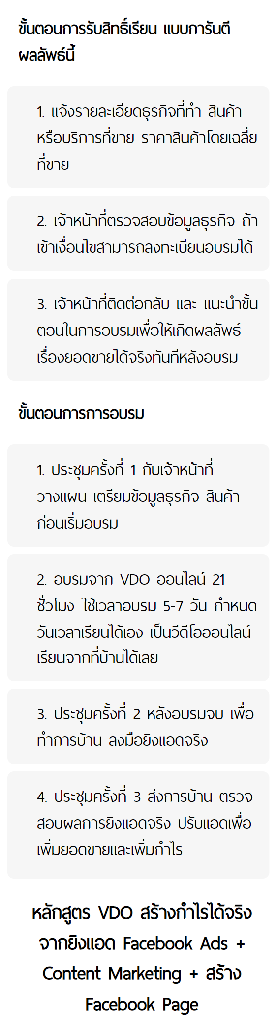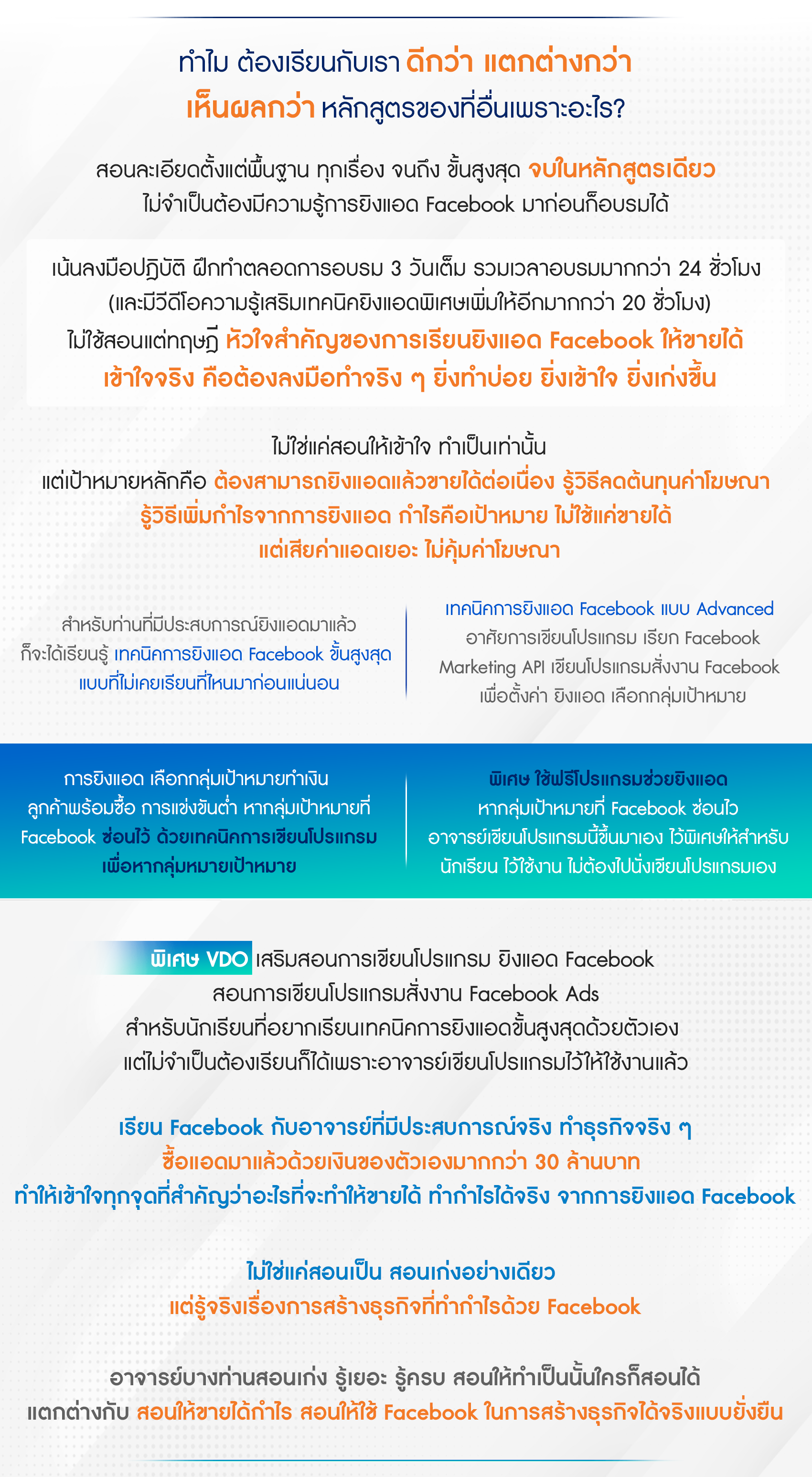 ไม่ใช้แค่สอนให้คุณตั้งโฆษณาเก่ง , ไม่ใช้แค่สอนให้คุณรู้ทุกเทคนิคในการกำหนดกลุ่มเป้าหมาย , ไม่ใช้แค่สอนให้คุณแค่อ่าน Report หรือดูค่าสถิติเป็นทุกค่า เพราะ ต่อให้คุณตั้งโฆษณาเก่งมาก หรือ รู้และเชี่ยวชาญในทุกเครื่องมือโฆษณาที่ Facebook มีให้ แต่ถ้าคุณไม่รู้วิธีที่จะนำ